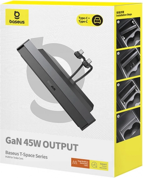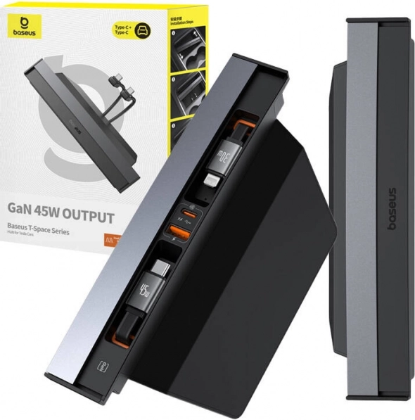 Baseus T-Space este un hub elegant și funcțional, proiectat special pentru interiorul vehiculelor Tesla. Vă permite să încărcați comod până la patru dispozitive simultan – două cabluri retractabile USB‑C (0,8 m) pentru pasagerii din față și din spate, completate de conectorii USB‑C și USB‑A. Datorită tehnologiei GaN și puterii de până la 45 W, beneficiați de o încărcare rapidă și stabilă fără supraîncălzire.