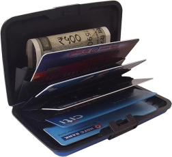 Stratul exterior este realizat din aluminiu, care previne scanarea nedorită a cipurilor. Interiorul, cu un spațiu în formă de evantai cu 6 compartimente, oferă perfectă ordine pentru carduri și cărți de vizită. Deschidere și închidere ușoară este asigurată de un buton practic.