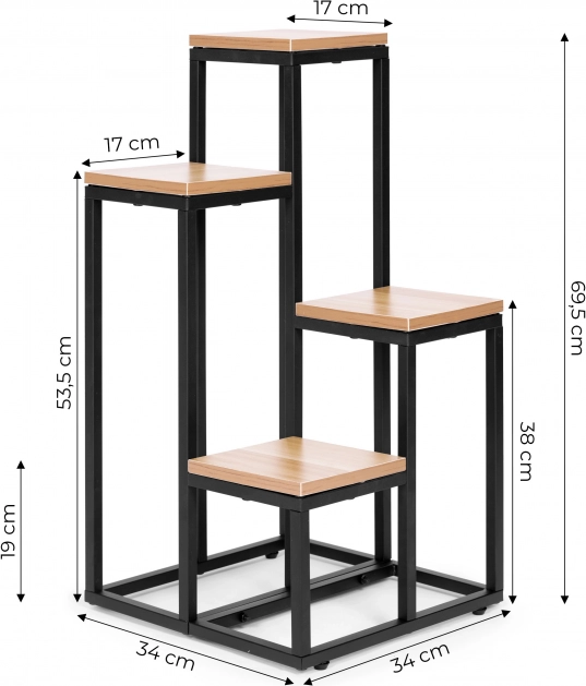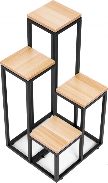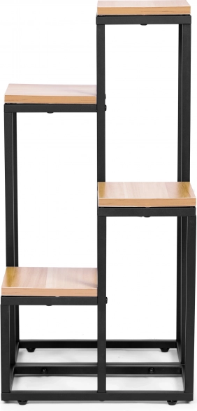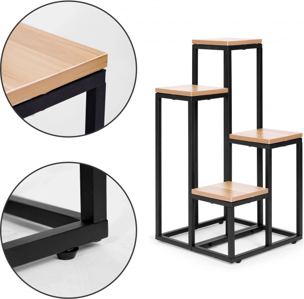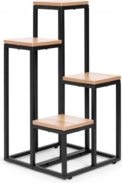 Suport modern pentru plante de la ModernHome completează excelent interiorul dumneavoastră. Dispune de patru rafturi la diferite înălțimi, care permit aranjarea plantelor de dimensiuni variate. Întregul suport este realizat din metal și MDF în culoarea nuc deschis, ceea ce garantează stabilitatea și întreținerea ușoară.