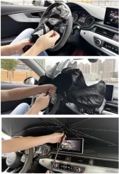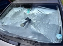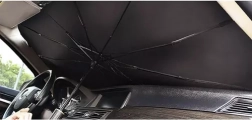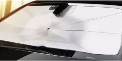 Parasolarul se deschide la fel ca o umbrelă și se fixează ușor pe partea interioară a parbrizului. Stratul special argintiu reflectă razele solare, menținând interiorul mașinii rece.