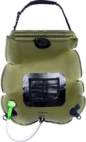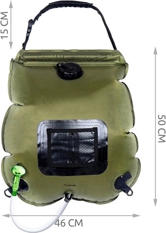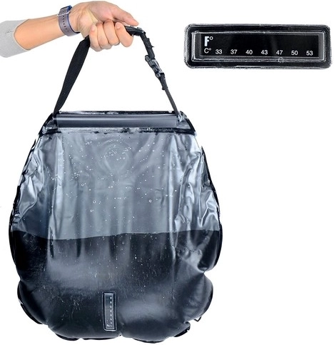 Dușul solar cu volum de 20 de litri oferă câteva minute de clătire confortabilă după sport, înot în mare sau la camping. Apa este încălzită exclusiv de energia solară, iar temperatura se verifică ușor pe termometrul integrat (°C/°F). Partea din spate transparentă permite supravegherea cantității și a clarității apei.