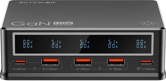 Încărcător de birou BlitzWolf 110 W cu PD, 3× USB‑A și 2× USB‑C, negru