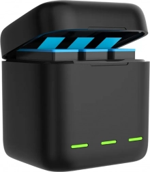 Cutia de încărcare Telesin 3 în 1 este soluția ideală pentru creatorii care au nevoie ca camerele de acțiune să fie mereu pregătite. Permite încărcarea simultană a până la trei baterii pentru GoPro HERO 12/11/10/9 și, datorită conexiunii USB‑C, o puteți conecta ușor la power bank, încărcător sau laptop. LED-urile integrate indică clar progresul încărcării – de la în curs, la aproape plin și până la finalizat.