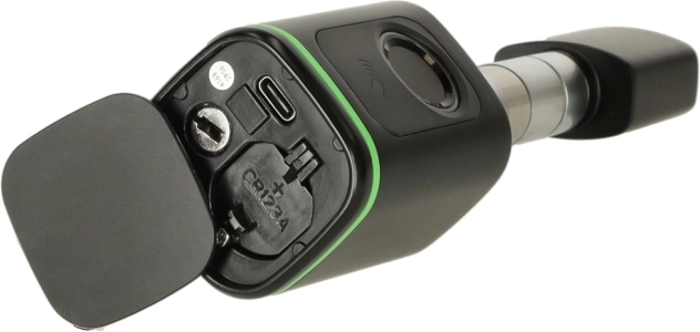 Construcția robustă din aluminiu și alamă este proiectată pentru utilizare la interior (IP50). Datorită alimentării cu baterie CR123A evitați cablurile – când se descarcă, este suficient să înlocuiți bateria. Rezerva sub forma cheii clasice asigură accesul și în caz de urgență.