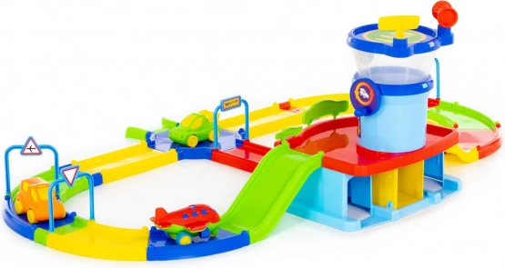 Sistemul de trasee multicolore cu poduri, tuneluri și conexiuni pentru vehicule și avioane asigură o rulare lină și numeroase scenarii de joc.