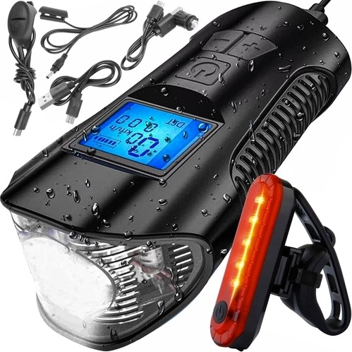 Lămpile LED rezistente la apă pentru cicliști asigură iluminare frontală excelentă și vizibilitate din spate, contribuind la siguranța pe drum. În plus, datorită designului multifuncțional, includ un claxon zgomotos și un vitezometru care înregistrează distanța, viteza și timpul de mers. Lampa practică oferă patru moduri diferite de iluminare și este echipată cu o construcție rezistentă la apă pentru utilizarea în diverse condiții meteorologice.