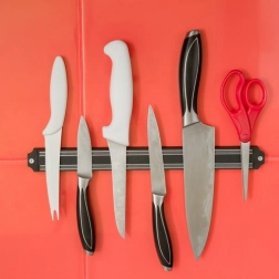 Instalarea durează doar câteva minute: în pachet găsiți dibluri de montaj; este suficient să dați găuri și să fixați pe perete; opțional se poate folosi și bandă dublu-adezivă. Șina este ideală pentru bucătărie, garaj, atelier, birou sau hol – de la cuțite și teluri până la clești, imbusuri sau chei.