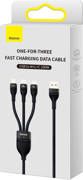 Cablu USB Baseus Flash Series 3‑în‑1 este ideal pentru cei care au nevoie de încărcare rapidă, sigură și eficientă a mai multor dispozitive în același timp. Datorită universalității sale, puteți încărca cu ușurință telefoane inteligente, tablete, baterii externe și alte dispozitive cu conectori USB‑C, Micro USB și Lightning.