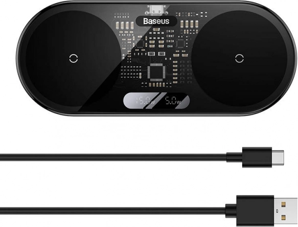 Încărcătorul wireless Baseus oferă o încărcare rapidă și eficientă a două dispozitive simultan, atât pentru dispozitive iOS, cât și Android. Este echipat cu un afișaj LED digital care arată performanța curentă a încărcării.