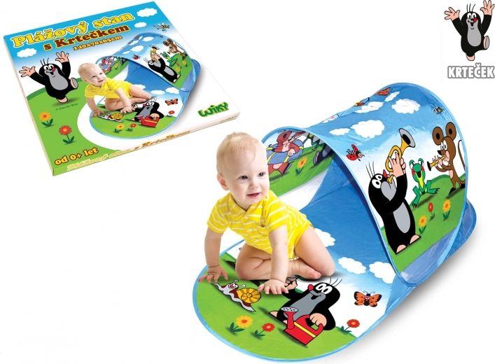 Bucură-te de confort și distracție cu simpaticul cort de plajă cu motiv KRTEK. Datorită construcției ușoare și sistemului simplu de pliere, este ideal pentru copii atât în interior, cât și în aer liber. Este perfect ca adăpost împotriva soarelui pe plajă sau ca spațiu de joacă în grădină.