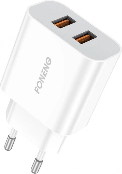 Încărcătorul rapid de priză FONENG poate alimenta două dispozitive simultan datorită celor două porturi USB și puterii maxime de 12 W (2,4 A). Cipul inteligent integrat ajustează automat curentul în funcție de dispozitivul conectat și protejează împotriva supraîncălzirii, supraîncărcării și scurtcircuitului pentru siguranță maximă și o durată de viață mai lungă a bateriei.