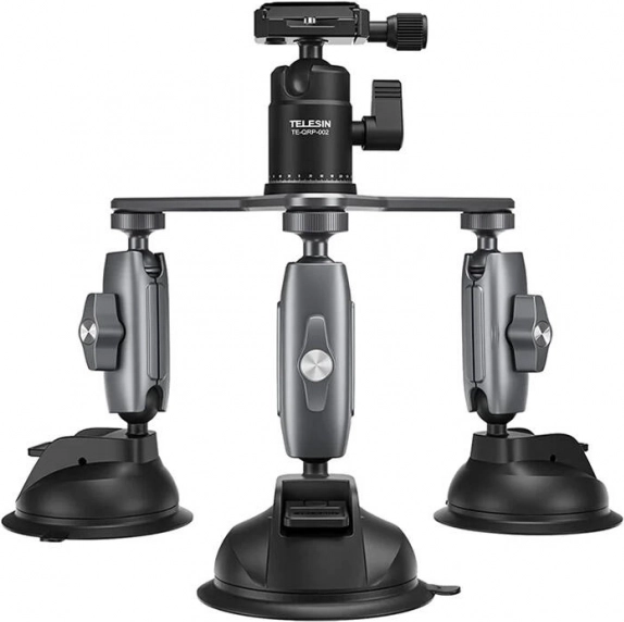 Suportul cu ventuză Telesin cu trei brațe este o soluție fiabilă pentru filmări în mașină și în afara ei. Trei ventuze puternice oferă stabilitate maximă pe capotă, sticlă, uși sau alte suprafețe plane și netede. Capul rotativ, cu reglaj fin, vă permite să setați cu precizie unghiul ideal al cadrului.