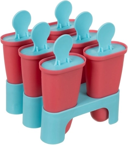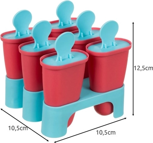 Construcția inteligentă oferă 6 forme cilindrice pentru înghețare uniformă. Capacul funcționează ca bețișor, cu prindere rotundă confortabilă și trei orificii pentru o fixare fermă în masa înghețată, astfel încât, după scoaterea din formă, înghețata nu alunecă. Baza stabilă menține formele perfect verticale la umplere și la congelare, ceea ce minimizează murdăria.