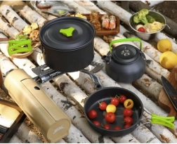 Set compact de veselă pentru camping pentru 2 persoane, cu suprafață antiaderentă și mânere pliabile. Include oală, tigaie, ceainic, tacâmuri pliabile, pahare pliabile și un săculeț de transport practic. Ideal pentru camping, drumeții și gătit în aer liber.