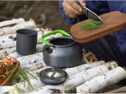 - Echipare completă – oală, tigaie, ceainic cu capac, capac universal, 2x cuțit, 2x furculiță, 2x lingură, 2x carabinieră, 2x pahar pliabil, 2x husă pentru tacâmuri, săculeț de transport.