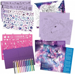Setul este conceput pentru a susține creativitatea, răbdarea și motricitatea fină. Cu numeroase autocolante, șabloane și forme din plastic, fiecare pagină devine o nouă provocare și aventură. Datorită sfaturilor clare și a 12 tehnicilor de desen cu instrucțiuni, copiii vor stăpâni noi procedee și efecte.