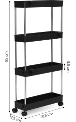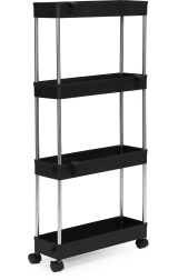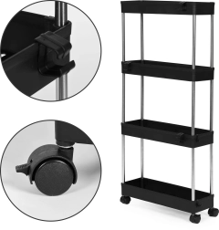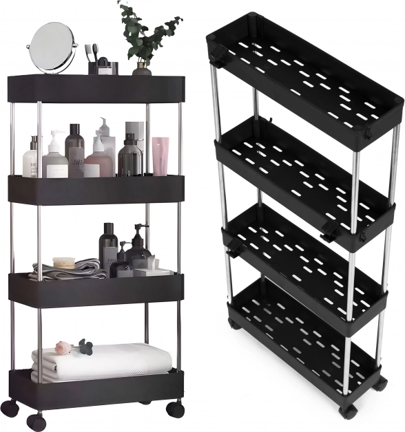 Păstrează ordinea chiar și în spații înguste. Acest raft îngust din plastic ModernHome oferă spațiu generos de depozitare pe 4 rafturi pentru cosmetice, prosoape, produse de curățenie sau alimente. Datorită profilului suplu, se potrivește perfect între dulapuri, lângă mașina de spălat sau lângă cabina de duș.