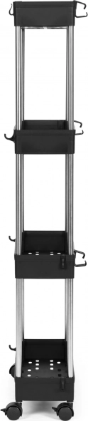 Roțile cu frână permit o mutare lină, două dintre ele pot fi blocate pentru poziționare sigură și stabilă. Tuburile de aluminiu rigidizează întreaga construcție și îi conferă un aspect modern. 8 cârlige suplimentare oferă loc pentru prosoape, bureți sau ustensile de bucătărie.