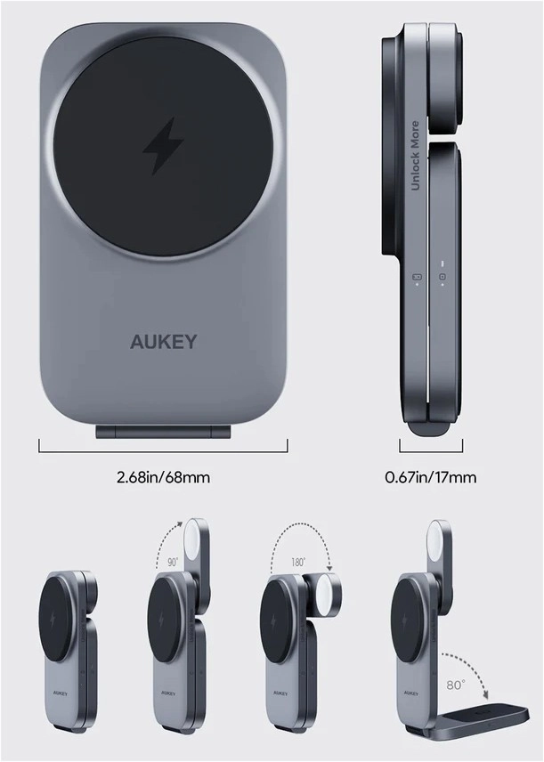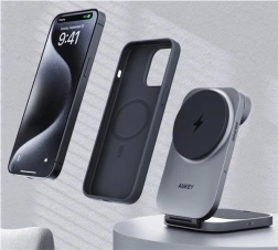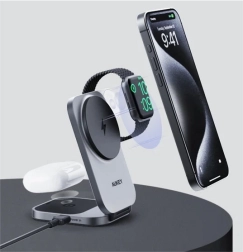 Bucurați‑vă de încărcare wireless rapidă și sigură pentru tot ecosistemul Apple într‑o singură stație compactă. AUKEY MagFusion utilizează Qi2 cu putere de până la 15 W pentru iPhone și încarcă simultan Apple Watch și carcasa pentru căștile AirPods. Fixarea magnetică stabilă și unghiul ajustabil o transformă în suportul ideal pentru apeluri video și vizionarea conținutului.