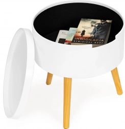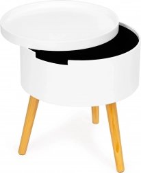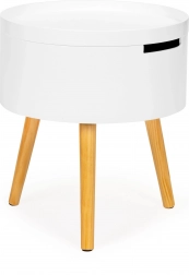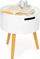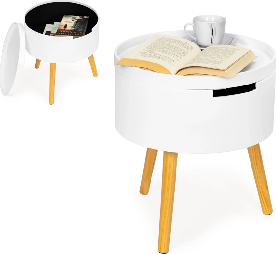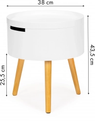 Specificații: Masa are un diametru de 38 cm și o înălțime de 43 cm, spațiu de depozitare de 36,5x14 cm și o greutate totală de doar 4 kg. Ambalată într-un carton special întărit și ușor de asamblat în 5 minute.