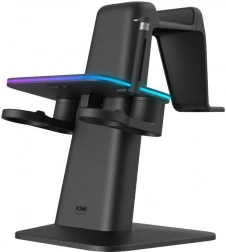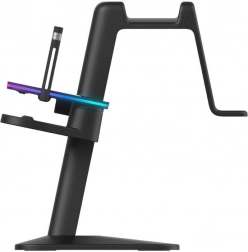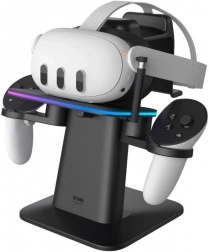 Suportul elegant negru cu iluminare RGB îmbină încărcarea și organizarea setului tău VR într-un singur loc. Conectorul magnetic asigură alimentarea sigură și comodă a căștilor META QUEST, în timp ce suporturile laterale țin controlerele la îndemână. Cu 16 efecte luminoase, îți poți personaliza atmosfera colțului de gaming.