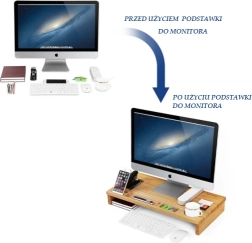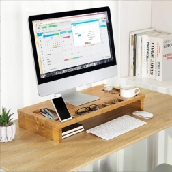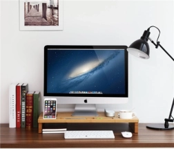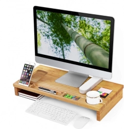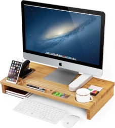 Îmbunătățiți-vă spațiul de lucru cu un suport stilat din bambus, care combină ergonomia și organizarea. Ridicând monitorul la nivelul ochilor, reduce tensiunea din zona gâtului și a spatelui, iar compartimentele bine gândite păstrează la îndemână toate cele necesare – de la telefon și instrumente de scris până la cană.