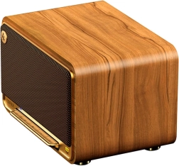 Design elegant din lemn cu accente retro, carcasă din MDF de 12 mm și mâner ascuns pentru transport confortabil. Până la 12 ore de autonomie cu o singură încărcare.