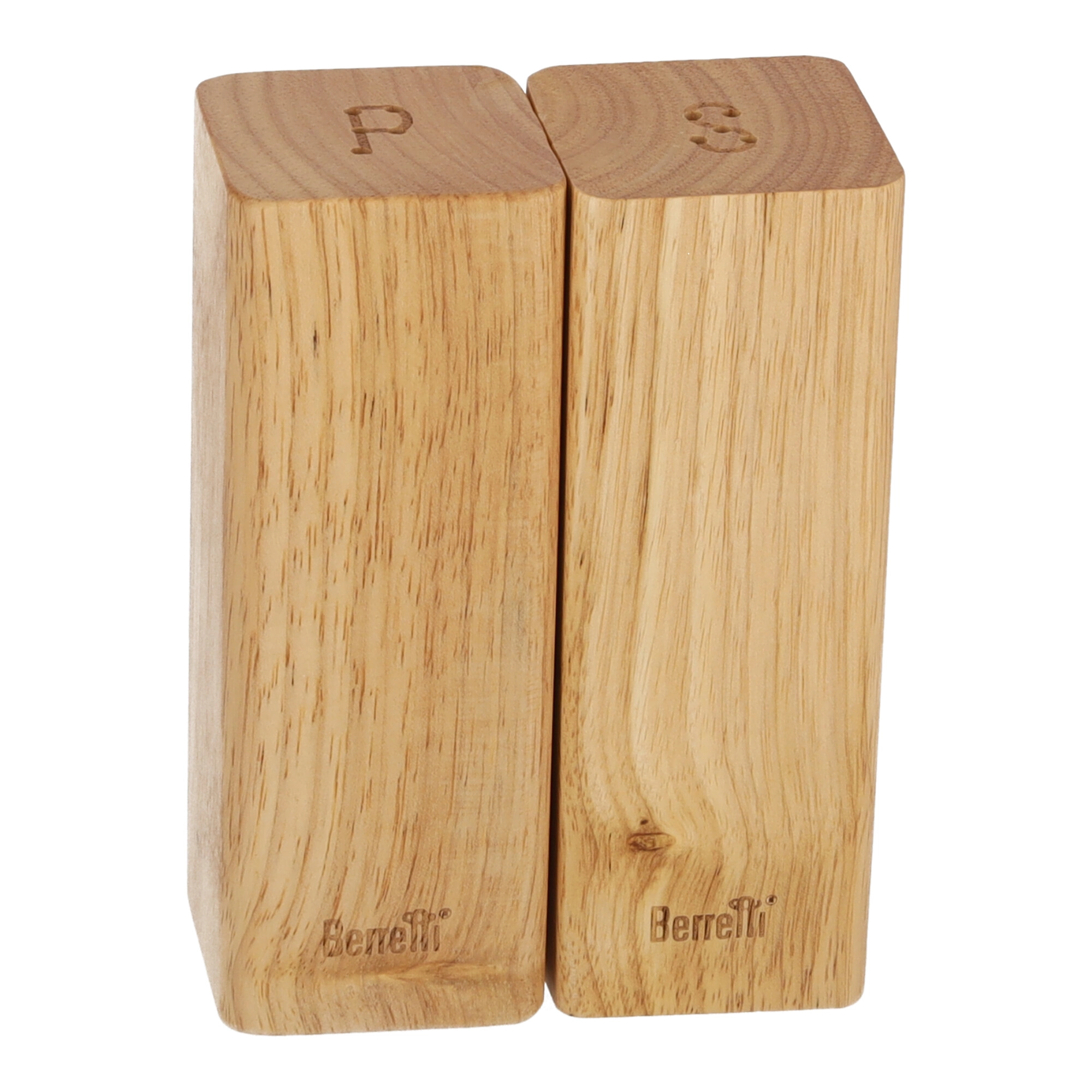 Setul BERRETTI, format din solniță și piperniță, este realizat din lemn natural de cauciuc. Designul său geometric simplu, cu dimensiunile 5,5x5,5x15 cm, oferă oricărei bucătării eleganță și modernitate. Lemnul de cauciuc asigură durabilitate și rezistență, adăugând totodată căldură și farmec natural. Acest set practic și stilat se potrivește pe orice masă și facilitează dozarea sării și piperului.