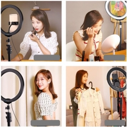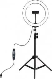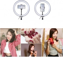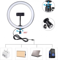 Suportul integrat pentru smartphone-uri cu lățimea 5,7–9 cm este plasat în centrul inelului pentru iluminare uniformă, fără umbre. Alimentare prin USB de la PC, adaptor sau powerbank.