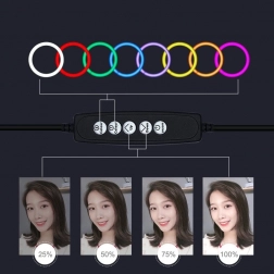 Lampa inelară cu putere de 15 W oferă moduri RGB colorate și alb natural. Cu ajutorul controlerului de pe cablu comutați rapid culoarea, ajustați luminozitatea și porniți/opriți lumina.