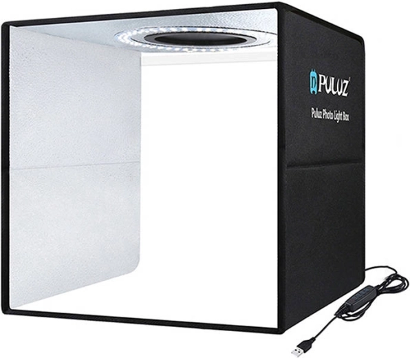 Pachetul include 6 fundaluri colorate (alb, negru, verde, roșu, albastru, portocaliu) pentru ajustarea rapidă a scenei. Cortul se pliază ușor, este alimentat prin cablu USB (2 m) și permite fotografierea din mai multe unghiuri, inclusiv cadre de sus. Suprafața internă reflectorizantă difuzează uniform lumina pentru rezultate consistente fără zone arse.