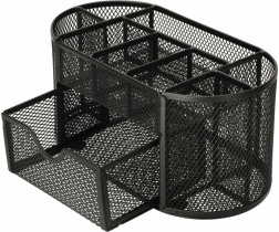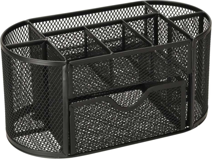 Organizatorul de birou practic din plasă metalică rezistentă vă ajută să aveți totul la îndemână și la locul lui. Cele nouă compartimente, împărțite inteligent, găzduiesc creioane, foarfeci, rigle, agrafe și notițe autocolante, în timp ce sertarul glisant este ideal pentru mărunțișuri și bilețele. Datorită construcției deschise, aveți întotdeauna o imagine clară asupra conținutului.