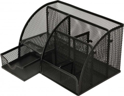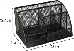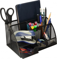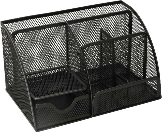 Plasa metalică neagră, rezistentă, arată elegant, oferă o vedere imediată asupra obiectelor stocate și se potrivește excelent la birou, în spațiul de lucru de acasă sau în camera unui student. Organizatorul poate fi folosit și pentru cosmetice, pensule de machiaj sau unelte mici.