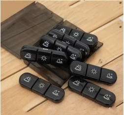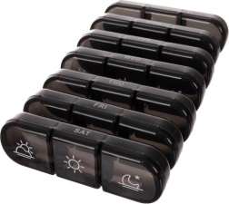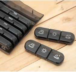Sistem clar de împărțire zilnică: Fiecare dintre cele șapte compartimente este divizat în trei camere separate pentru doze de dimineață, prânz și seară. Fiecare cameră se închide ferm cu clic, asigurând depozitarea în siguranță a medicamentelor.