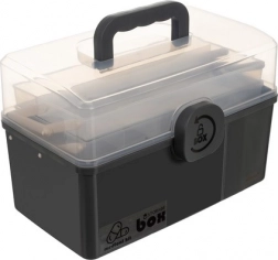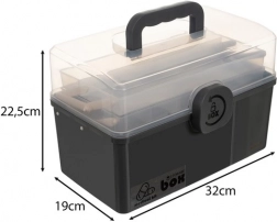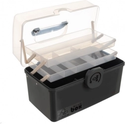 Rafturile rabatabile pe două niveluri, cu compartimente, sunt perfecte pentru comprimate, unguente, plasturi și cosmetice. Compartimentul inferior oferă spațiu suficient pentru flacoane și ambalaje mai mari. Construcția ușoară și mânerul ergonomic facilitează transportul acasă și în călătorii.