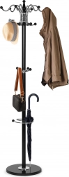 Ordinea în hol începe cu un cuier de calitate. Acest stativ de la ModernHome combină o construcție metalică rezistentă cu o bază grea, rotundă, din piatră, care asigură o stabilitate excelentă chiar și la încărcare maximă. Datorită aspectului atemporal în finisaj negru și cromat, se integrează ușor atât în interioare moderne, cât și clasice.