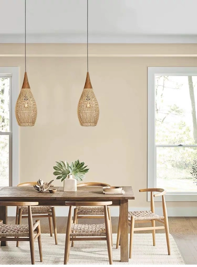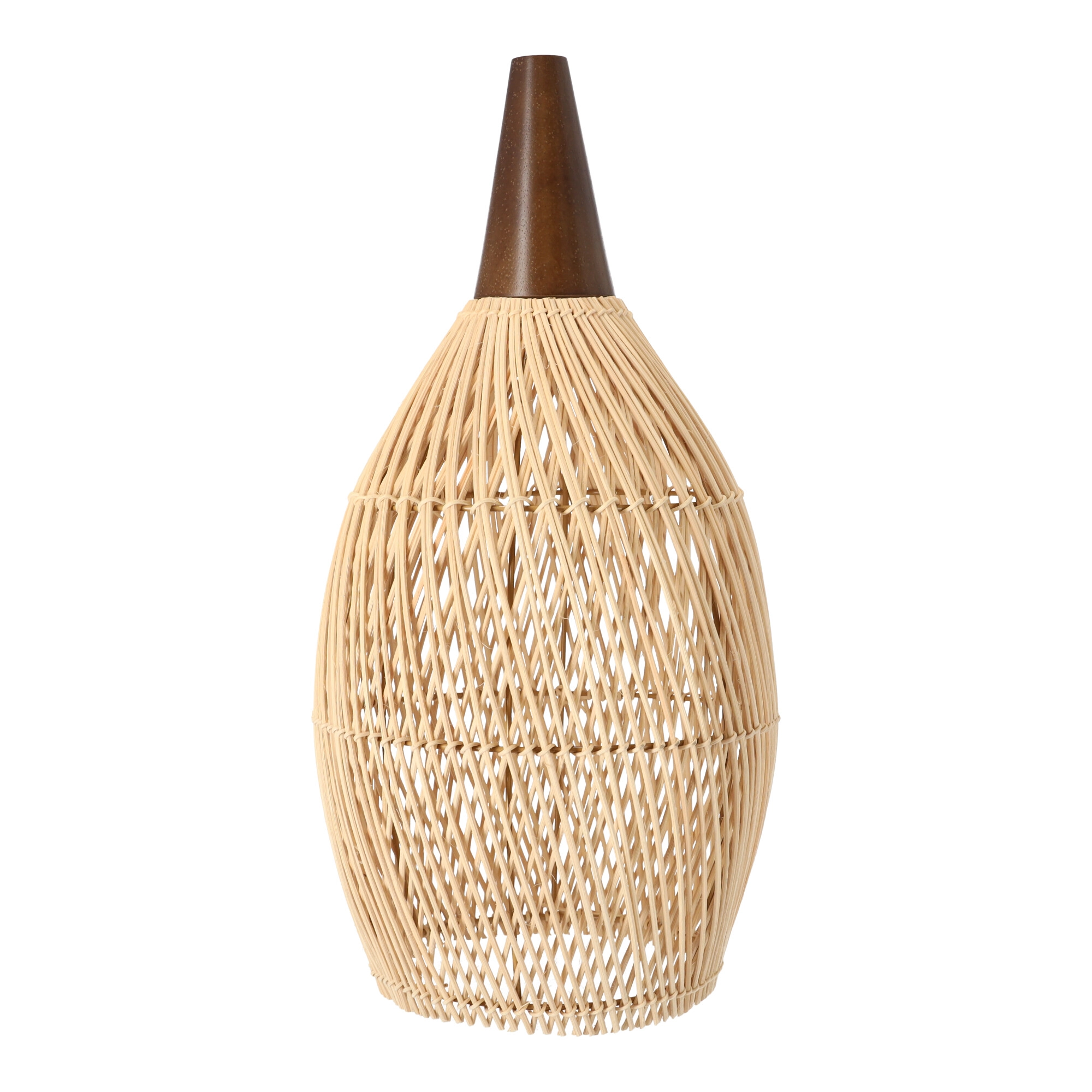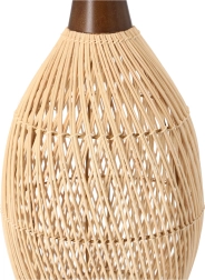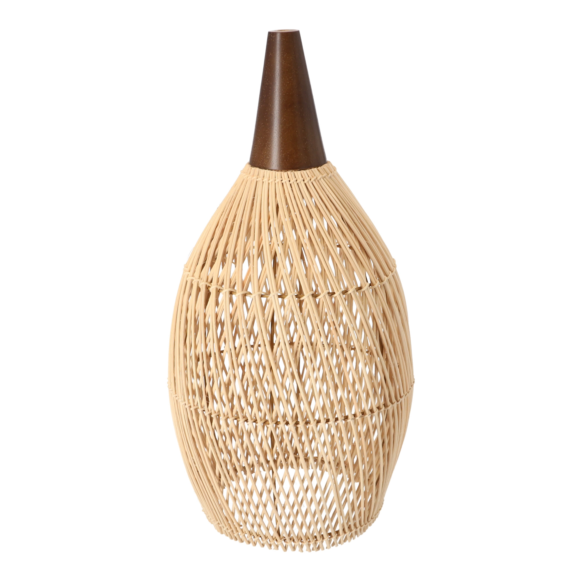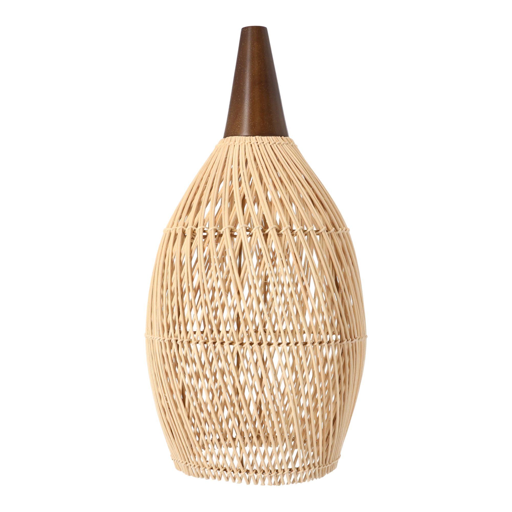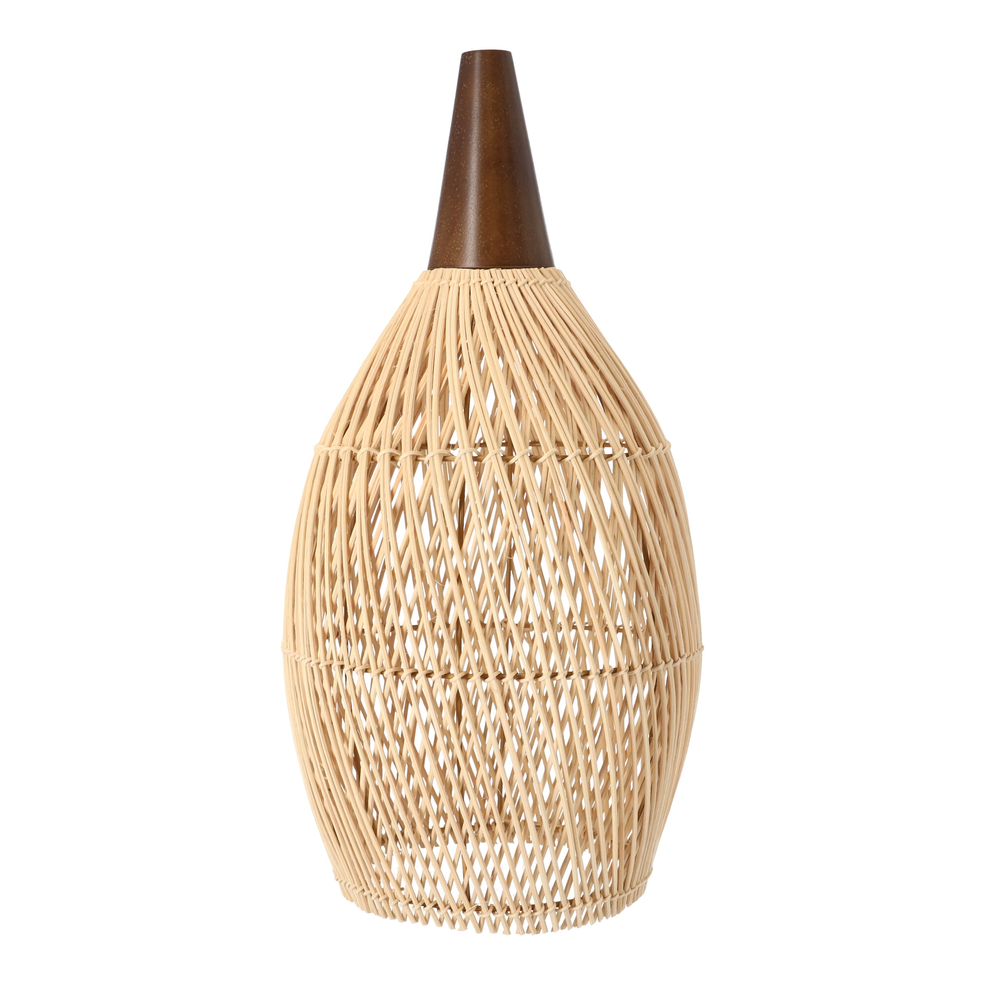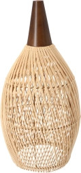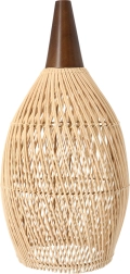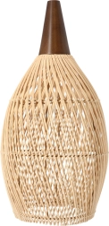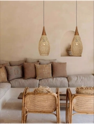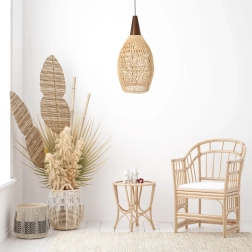 Lampa suspendată din ratan și lemn aduce în interior o iluminare ambientală caldă și un aspect natural boho. Datorită diametrului compact de 25 cm și înălțimii de 50 cm, este ideală deasupra mesei, în living sau dormitor. Suportă becuri E27 (recomandat 12 W), luminează o suprafață de 5–10 m² și, datorită cablului lung de 120 cm, se adaptează ușor spațiului tău.