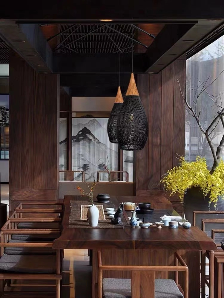 Combinația texturii autentice a ratanului cu accente din lemn în finisaj negru oferă spațiului căldură și eleganță.