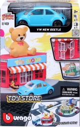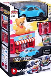 Extinde-ți colecția urbană cu setul Bburago City Magazin de jucării 1:43, care aduce detalii realiste și opțiuni excelente de joacă. Include un model de mașină Bburago din metal cu caroserie realizată cu precizie și numeroase detalii, o clădire de magazin de jucării din plastic cu uși mobile și accesorii pentru amenajarea străzii.