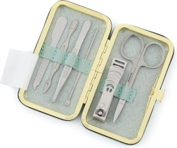 Acest set de manichiură elegant în etui din piele de culoare verde mentă este conceput pentru a fi compact și ușor de transportat. Setul include:
