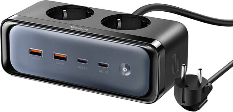 Priza multiplu McDodo este o alegere perfectă pentru a îmbunătăți confortul de încărcare al dispozitivelor tale, combinând un design elegant cu funcționalitate maximă. Echipată cu două prize de curent alternativ, două porturi USB-C și două USB-A, îți permite să încarci simultan mai multe dispozitive în mod eficient.