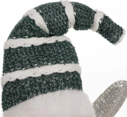 Căciula tricotată, eșarfa și ghetuțele în alb și verde închis oferă figurinei un aspect primitor și completează perfect atmosfera de iarnă și de Crăciun a locuinței.