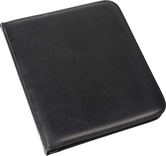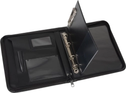 Diplomat elegant în format A5, în culoare negru mat, ideal pentru organizarea zilnică a documentelor. Oferă închidere cu fermoar, buzunare interne pentru documente și cărți de vizită, suport pentru instrumente de scris și mecanism cu 4 inele tip D20 pentru arhivare clară.
