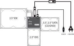 Conectarea simultană a unui dispozitiv SATA și a unui dispozitiv IDE accelerează transferul de date fără copiere pe discul intern al computerului. Alimentarea externă cu întrerupător asigură utilizarea în siguranță chiar și cu discuri mai mari de 3.5".