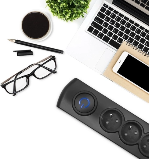 Comutatorul circular iluminat permite, printr-o singură apăsare, oprirea sau pornirea tuturor dispozitivelor conectate. Vezi clar când prelungitorul este sub tensiune.