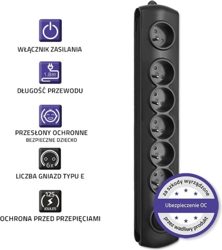 Alimentați în siguranță mai multe dispozitive dintr-un singur loc cu prelungitorul cu protecție la supratensiune, cu 6 prize și cablu de 1,8 m. Comutatorul de picior iluminat Quick Switch economisește timp și energie, siguranțele pentru copii și materialul PP ignifug sporesc siguranța. Elegantul design negru, posibilitatea de fixare pe mobilier și depozitarea cablului suplimentar asigură ordine acasă și la birou.