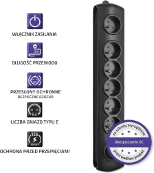 Întrerupătorul de picior iluminat Quick Switch permite pornirea sau oprirea alimentării ușor și rapid, fără a te apleca – indicația luminoasă arată clar când dispozitivele conectate sunt sub tensiune. Siguranța ta este asigurată de protecția la supratensiune cu varistor, protecții pentru copii în toate prizele și PP ignifug pentru carcasă. Producătorul își rezervă dreptul de a modifica specificațiile tehnice.
