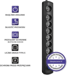 Siguranța este pe primul loc: varistorul integrat protejează împotriva vârfurilor bruște de tensiune, obturatoarele pentru protecția copiilor împiedică contactul nedorit, iar materialul PP ignifug crește rezistența în utilizarea zilnică. Designul bine gândit, în culoare neagră, se integrează perfect în interioarele moderne, permite înfășurarea cablului în exces în jurul corpului prelungitorului și oferă și posibilitatea montării pe mobilier.