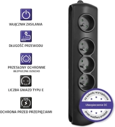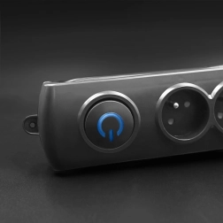Controlul este extrem de comod datorită întrerupătorului la pedală iluminat Quick Switch – o singură apăsare oprește sau pornește alimentarea tuturor dispozitivelor conectate. Siguranța este asigurată de elementele de protecție la supratensiune (varistor), capacele de siguranță pentru copii la toate prizele și execuția din PP ignifug.