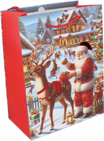 Pungă cadou stilată, mărimea L, cu dimensiunile 32 × 41,5 × 12 cm, ideală pentru ambalarea cadourilor mai mari. Oferă un motiv de Crăciun, construcție robustă și transport facil. Disponibilă în 4 variante de motive pentru o atmosferă festivă perfectă.